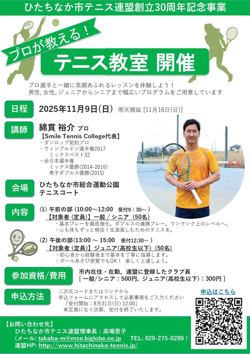 ●ひたちなか市テニス連盟創立30周年記念事業 「プロが教える!テニス教室」...(予定)2025年11月9日